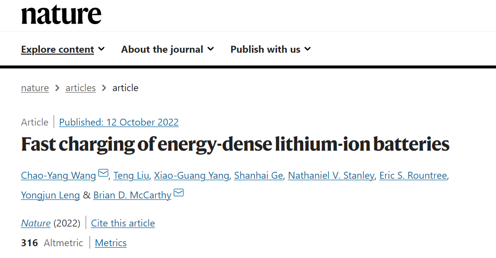 Chao-Yang Wang, Teng Liu, Xiao-Guang Yang, Shanhai Ge, Nathaniel V. Stanley, Eric S. Rountree, Yongjun Leng, Brian D. McCarthy.Fast charging of energy-dense lithium-ion batteries. Nature, (2022).