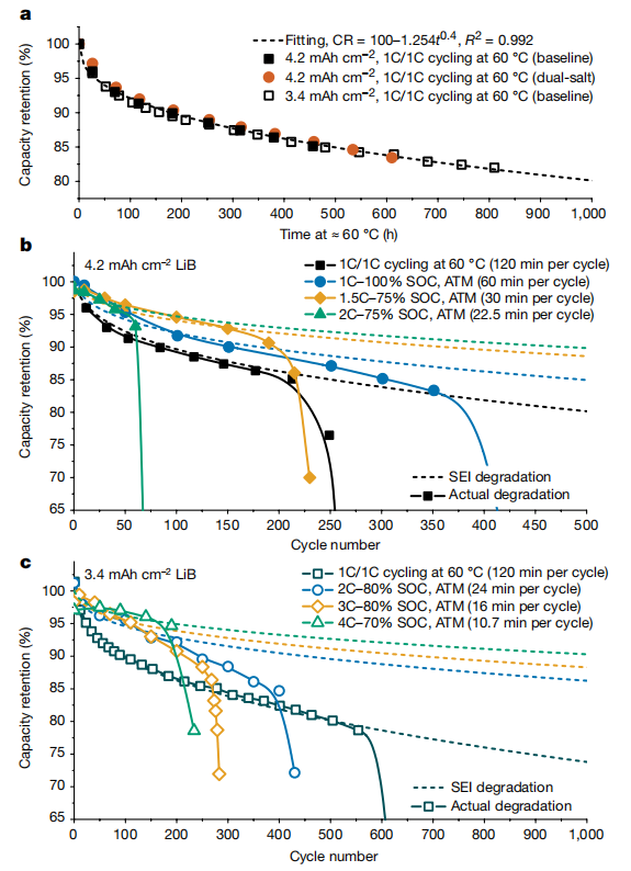 图2 高能量密度LIB的ATM循环。a, 60℃下1C充放电循环由于SEI增长引起的容量衰减。b, 面载量为4.2 mAh cm-2的电池应用ATM分别以1C、1.5C、2C充电至100%、75%、75%SOC。c, 面载量为3.4 mAh cm-2、采用基准电解液的电池应用ATM分别以2C、3C、4C充电至80%、80%、70%SOC。