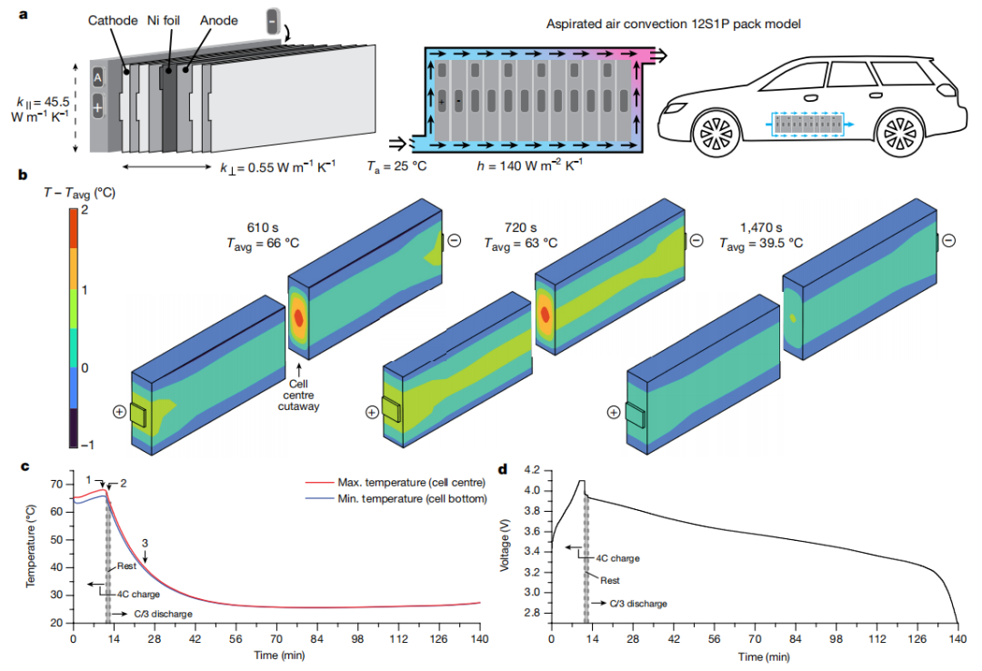 2)构建了这样一个电池组,以评估其冷却和安全性,并证明热调制4C充电只需要空气对流冷却。