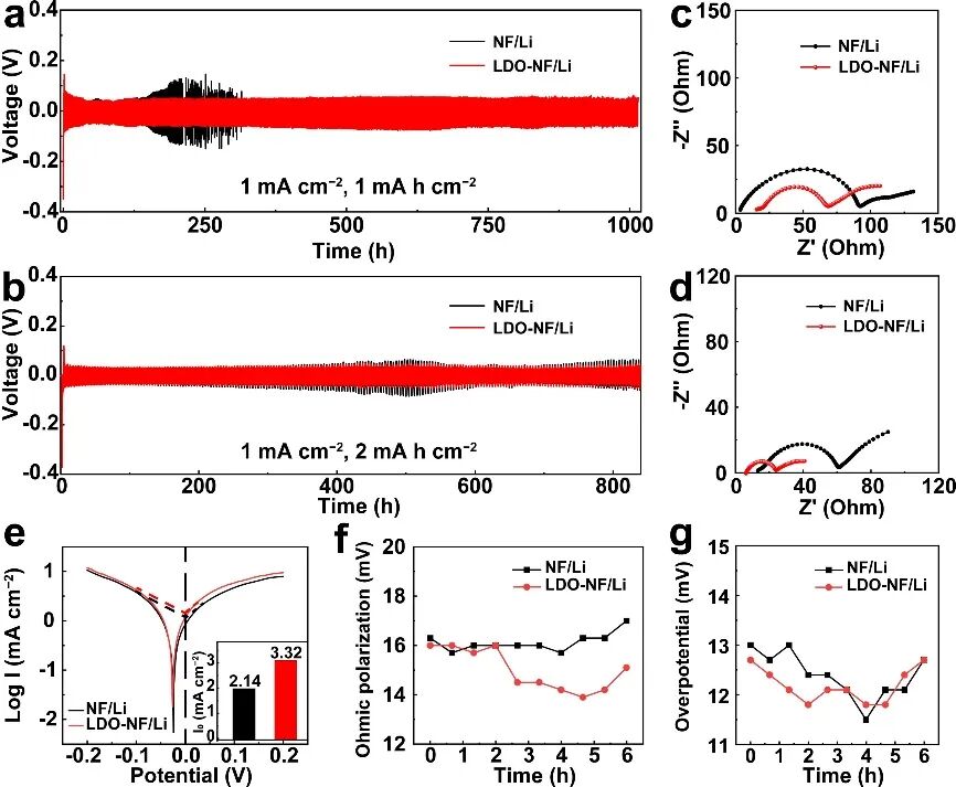 图5 在(a)1 mA cm−2和1 mA h cm−2和(b)1 mA cm−2和2 mA h cm−2条件下,NF/Li和LDO-NF/Li对称电池性能。在1 mA cm−2、1 mA h cm−2条件下,(c)循环前和(d)循环50圈后NF/Li和LDO-NF/Li对称电池阻抗性能。(e)在1 mA cm−2、1mA h cm−2条件下循环10圈后Tafel曲线。NF/Li和LDO-NF/Li的(f)欧姆极化和(g)过电位。