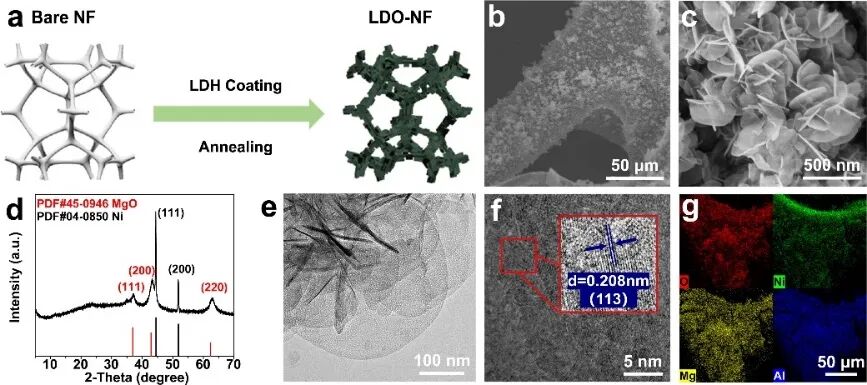 图2 (a)LDO-NF制备示意图。(b)、(c)不同放大倍数的LDO-NF SEM图像。(d) LDO-NF的XRD谱图。(e)、(f)不同倍数的LDO-NF TEM图像。(g)LDO-NF EDX元素图谱。