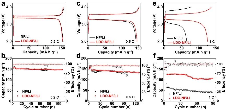 三维复合负极在1 mA cm−2的电流密度下表现出1000小时的长循环寿命,Tafel结果显示LDO-NF/Li的交换电流密度远高于NF/Li,证明LDO-NF/Li电极具有良好的电镀/剥离动力学性能。在欧姆极化和过电位方面,LDO-NF/Li电极显示出比NF/Li电极更低的电阻。三维复合负极与高面容量的磷酸铁锂(LFP)和硫正极相匹配组装的全电池,展现出稳定的循环性能与实际应用的可行性。