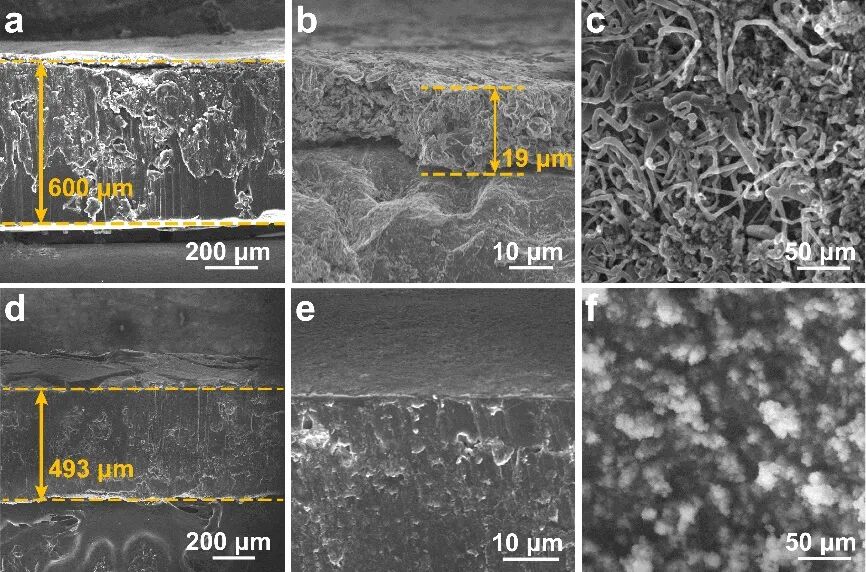 图4 在电流密度为1 mA cm−2,沉积量为1 mA h cm−2条件下,循环10圈后,NF/Li电极的(a)、(b)截面和(c)平面SEM图像。循环10圈后,LDO-NF/Li电极的(d)、(e)截面和(f)平面SEM图像。