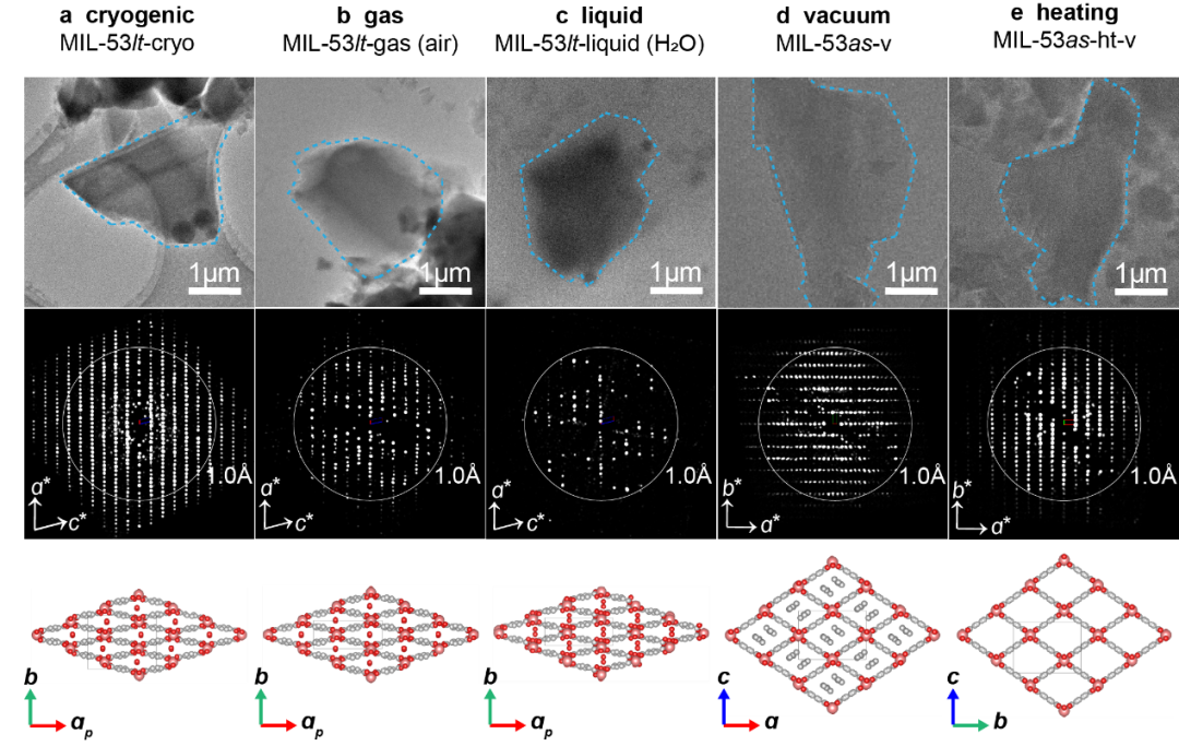 Fig. 2 | TEM images, environmental 3D ED data and determined structures from single crystals (MIL-53) under different conditions. The 3D ED data are projected along the (a-c) [010] and (d, e) [001] directions. Each projection is from a single 3D ED dataset without data merging. (a) MIL-53lt-cryo: the low temperature phase prepared by plunge-freezing and cryogenic transfer protocols. (b) MIL-53lt-gas (air): MIL-53lt in the static air (0.1 MPa). (c) MIL-53lt-liquid (H2O): MIL-53lt covered with liquid water. (d) MIL-53as-v: the as-synthesized phase MIL-53as under high vacuum state. (e) MIL-53as-ht-v: the phase after calcination of MIL-53as at 603 K and high vacuum for 2 hours. Particles marked with blue dashed lines were used for collecting 3D ED data. White circles in diffraction data represent the resolution of 1 Å. Source data are provided as a Source Data file.
