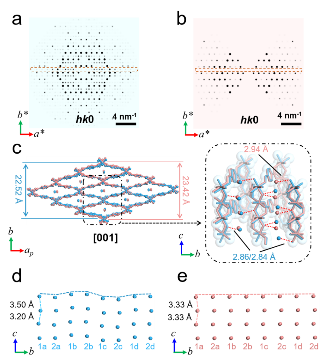 Fig. 3 | Comparison of two structures obtained from crystals under different environments. (a, b) The slices at hk0 plane cut from reconstructed reciprocal lattice of data of (a) MIL-53lt-cryo and (b) MIL-53lt-gas (air). Compared with (b), extra reflections can be clearly observed in (a) as shown in the dashed boxes, indicating the structural change after the cryogenic sample preparation. For a better display, reflection intensities are 0.8 power of original values. (c) Overlap of two structures of MIL-53lt-cryo (blue) and MIL-53lt-gas (air) (pink). The inset shows possible hydrogen bonds between oxygen sites (guest H2O molecules) and bridging oxygen atoms in the framework, distances of which are 2.86 Å or 2.84 Å for MIL-53lt-cryo and 2.94 Å for MIL-53lt-gas (air). The frameworks and sites of H2O in the channels are slightly different. ap indicates the projected direction of the a-axis. (d, e) The different arrangements of guest H2O