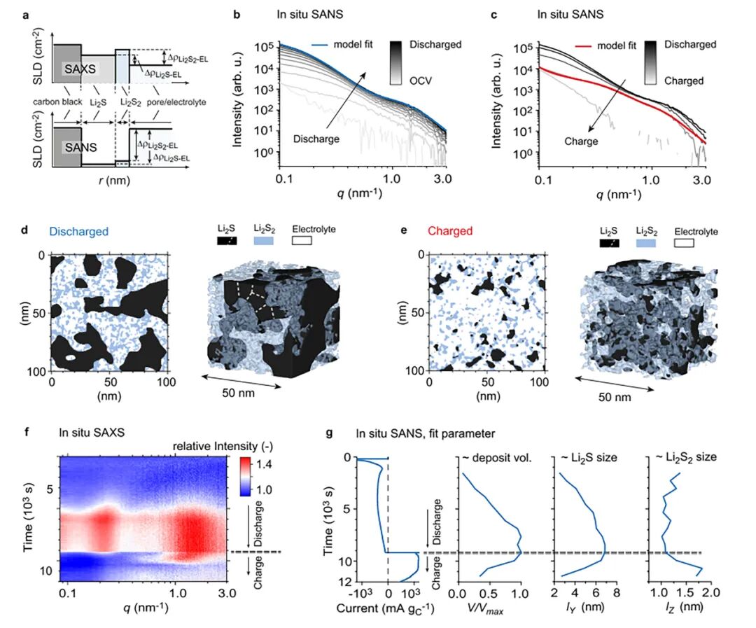 锂硫电池(Li-S)作为实现“双碳”战略目标的重要电池体系之一,具有高理论容量(1670 mAh g-1)、高丰富度以及低成本等优势。然而,由于硫不完全利用,高负载性能差,容量衰减快,倍率性能低以及多硫化物在负极处不可逆反应等问题的存在,阻碍了高性能Li-S电池的实际应用,这些问题都可以归因于对S向Li2S转化机制的理解不足。目前,研究者对Li2S形成和溶解过程的物理化学机制仍存在较大争议。许多研究认为Li2S是通过在碳电解质界面处直接电还原Li2S2或长链多硫化物(PSs)形成的。然而,像Li2S这样的绝缘体原则上在电沉积过程中是受限的,Li2S沉积物大尺寸和多孔隙的特点也表明它们可能是在溶液传输过程中形成的,一些研究认为,溶液传输可以解决多硫化物不均匀溶解的问题。此外,另一种可能性是将分子Li2S2直接电还原为溶解的Li2S,然后沉淀形成固体微晶,类似于Na-O2和K-O2电池中Na2O或K2O的形成。但是,这些研究涉及到尺寸极小的固体Li2S2,几乎无法用实验验证。原位X射线和中子散射技术,可以动态监测到亚纳米到百纳尺度内样品结构信息。因此,借助该技术有望解析锂硫电池放电过程产物,从而深入了解锂硫电池容量衰减机制。