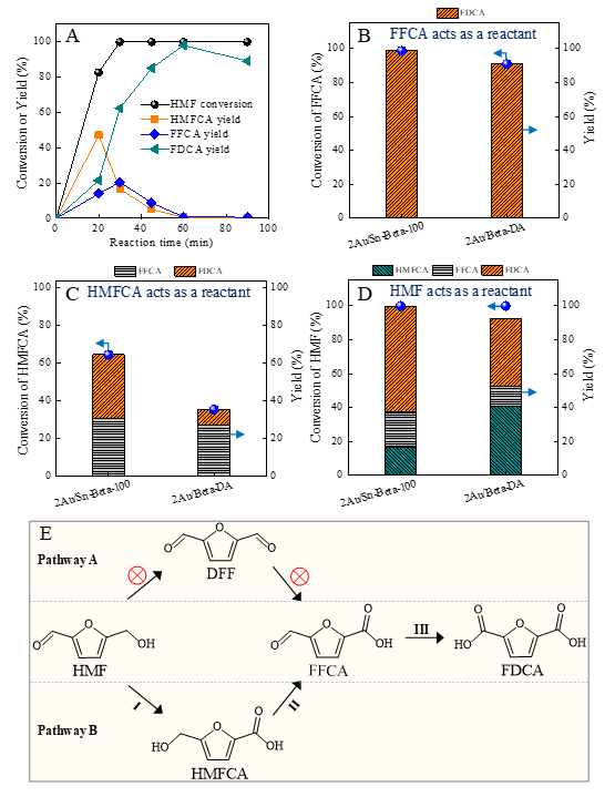Fig. 10. (A) Time-dependent HMF conversion and products yield over 2Au/Sn-Beta-100 catalyst. Catalytic performance of 2Au/Sn-Beta-100 and 2Au/Beta-DA for (B) FFCA, (C) HMFCA and (D) HMF oxidation, respectively. Reaction conditions: reactant, 0.25 mmol; catalyst, 50 mg; water, 15 mL; Na2CO3, 0.25 mmol; O2, 1 MPa; temperature, 140 oC; agitation speed, 600 rpm; time, 30 min. (E) Reaction pathways for the aerobic oxidation of HMF to FDCA.