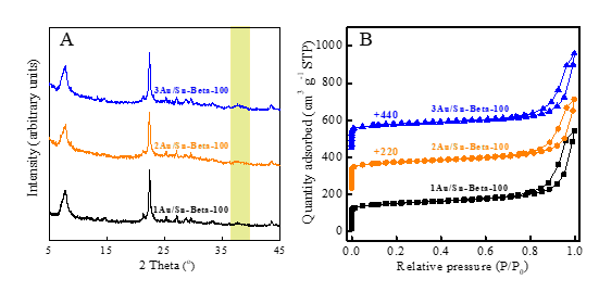 Fig. 3. (A) XRD patterns and (B) N2 adsorption-desorption isotherms of Au-impregnated Sn-Beta-100 sample.