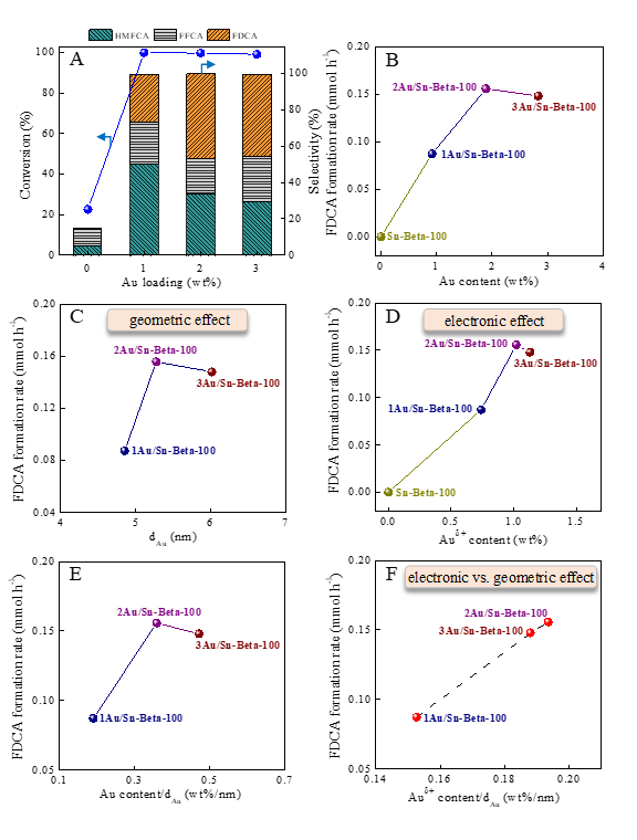Fig. 8. (A) The influence of Au loading on catalytic performances for the aerobic oxidation of HMF. Reaction conditions: HMF, 0.25 mmol; catalyst, 40 mg; water, 15 mL; Na2CO3, 0.25 mmol; O2, 1 MPa; temperature, 130 oC; time, 45 min; agitation speed, 600 rpm. The dependence of FDCA formation rate (B) on Au content, (C) on Au particle size (dAu), (D) on Auδ+ content, (E) on Au content/dAu ratio and (F) on Auδ+ content/dAu ratio, respectively.
