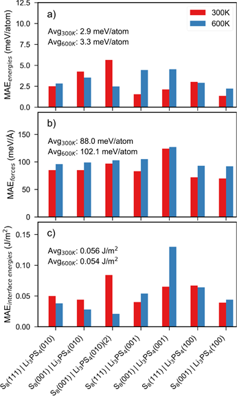 图6a和b展示了在AL过程中不同界面测试的MAEenergies和MAEforces演化过程。经过约15次AL迭代后,所有界面的测试MAEenergies和MAEforces分别收敛到5 meV atom−1以下和150 meV Å−1以下。