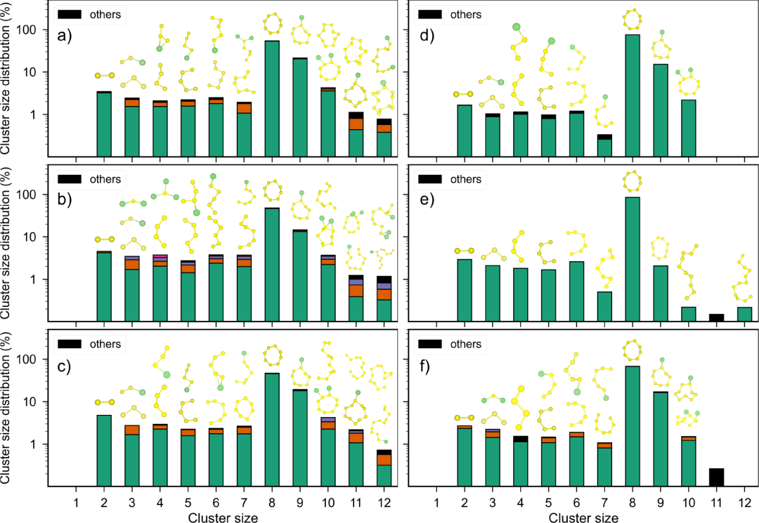 图9. 界面上团簇的平均大小分布和组成,(a) S8(001)|Li3PS4(001), (b) S8(001)|Li3PS4(010), (c) S8(001)|Li3PS4(100), (d) S8(111)|Li3PS4(001), (e) S8(111)|Li3PS4(010), 和 (f) S8(111)|Li3PS4(100)。@ACS