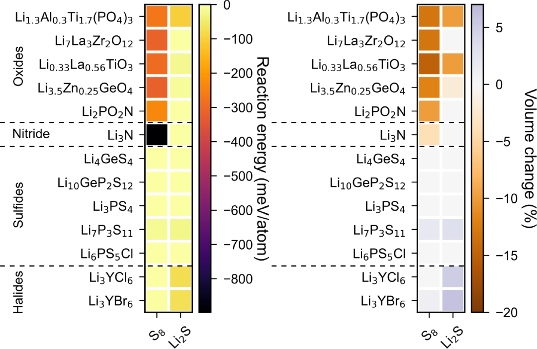 图5. 含硫化物缓冲层材料的不同电解质和电极的反应能(左)和体积变化(右)。@ACS