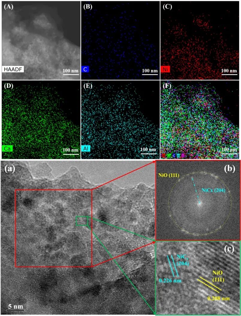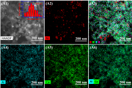 catalyst.Figure 5. STEM micrograph and EDS elemental maps of the reduced TC-10Ni-CaAl2.6 catalyst.图4的扫描电镜结果表明热移除碳模板后的多功能催化剂(TC-10Ni-CaAl2.6)呈现出蠕虫状多孔结构,催化剂颗粒被孔结构有效地进行了分隔且颗粒的平均尺寸为67nm。很显然,这样的多孔结构能够有效避免吸附剂颗粒或者催化剂颗粒间的接触,从而有利于抑制颗粒团聚。图5的透射电镜结果进一步证实了多孔的存在,同时可以很明显地看到Ni颗粒间被孔所分隔,并且孔的存在延长了颗粒间的移动距离。Figure 6. (A)