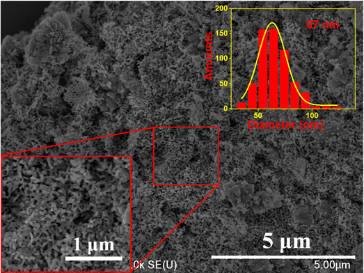 HRTEM of the carbonized TC-NiCaAl-LDO sample.图3展示了对复构LDH进行热处理后的透射电镜图。由图3(A)可知,热处理后的样品中出现了大量的碳元素信号,表明惰性气氛热处理后四环素会进行碳化形成碳模板。且元素分布图显示碳元素与其他元素呈现均匀分布,揭示了原位碳化过程有利于形成均匀分布的碳模板。更进一步的高倍透射结果表明NiO颗粒被包覆在碳层中,并且表层会形成NiCx物种,进而能够有效地阻止NiO颗粒间的接触烧结。Figure 4. SEM image of the reduced TC-10Ni-CaAl2.6