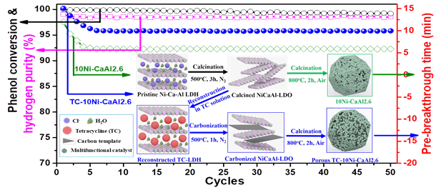 吸附强化(SESR)制氢技术通过对重整反应过程中的CO2进行原位捕获,实现一步生产高纯度的氢气,并同时对CO2进行固定。这一技术是跨入“氢经济”和实现碳排放控制的重要手段。然而,这一技术的实际应用严重受限于高温条件下吸附剂和催化剂的烧结引起的失活。本工作利用层状双金属氢氧化物(layered double hydroxide, LDH)的“记忆效应”,在其复水再次形成LDH的过程中吸附四环素(tetracycline)作为层间阴离子,吸附的四环素经过碳化处理后原位生成碳模板,进一步热处理生成多孔的Ni-CaO-Ca12Al14O33多功能催化剂。该催化剂用于苯酚吸附强化制氢过程(SESRP),可以得到浓度为98.3 vol%的氢气,并且循环50圈后,氢气浓度保持在98 vol%,同时吸附强化性能仅下降33%。本研究为SESR技术提供了设计稳定的多功能材料的新思路,并可能有助于设计用于其他源于LDH结构的材料。生物质气化热解过程是实现生物质转化到液体或气体燃料的关键过程,但是该工艺会产生大量的污染物,如焦油等。目前,对于这部分污染物(焦油)的处理措施有限,大多是直接排放到环境中。焦油的成分较为复杂,同时经常会含有较多量的水,这些都极大地增加了处理过程的难度。以其中的主要成分-苯酚为例,尽管通过加氢脱氧等手段可以将苯酚转化为环己烷与环己醇等有用产物,但是这些转化过程均对苯酚的纯度要求较高,而从含水焦油中分离满足要求的苯酚耗能过大。因此,开发直接利用苯酚溶液的转化技术对焦油等含苯酚废水的处理意义重大。