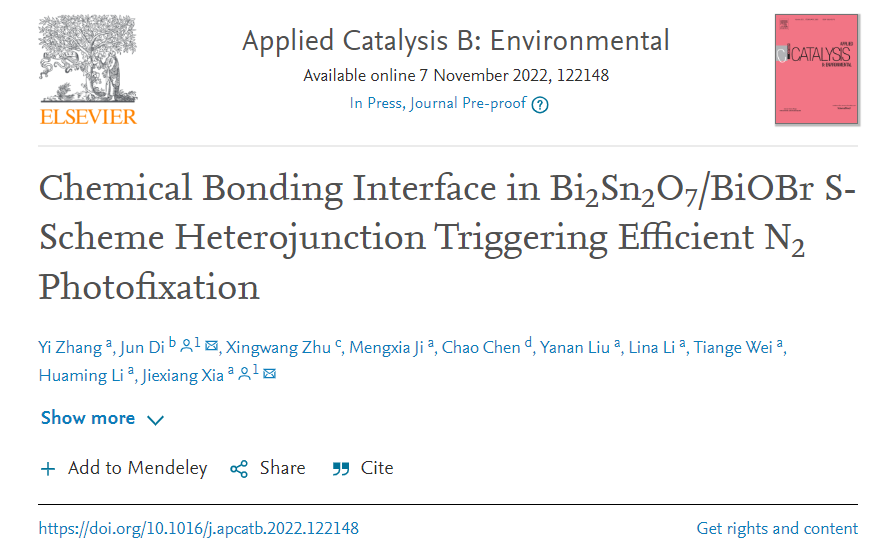 本工作中,来自南京理工大学狄俊教授和江苏大学夏杰祥教授等合作在Applied Catalysis B: Environmental上发表了题为“Chemical Bonding Interface in Bi2Sn2O7/BiOBr S-Scheme Heterojunction Triggering Efficient N2 Photofixation”的研究性论文,探究了构建具有化学键合界面连接的S型异质结光催化剂对提升光催化固氮性能的影响机制。