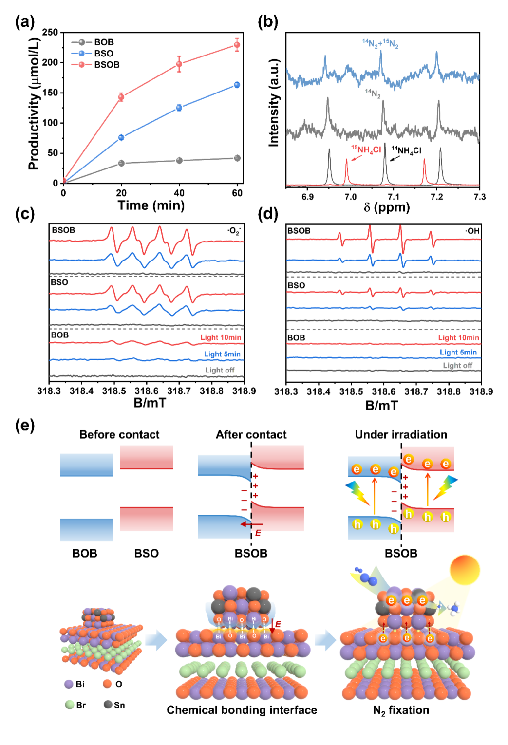 其机理为:当形成BSOB时,BSO中的电子会自发地扩散到BOB,在BSO中形成电子耗尽层,并在BOB中形成电子累积层。受内建电场影响,BOB和BSO的能带发生弯曲,形成S型异质结。在光照中,BOB和BSO的电子分别被激发跃迁到CB。界面静电作用使得BOB的CB中的电子通过Bi-O键与BSO的VB中的空穴重组,导致BSO的CB中电子能够被有效保留,从而BSOB表现出增强的光催化固氮能力。