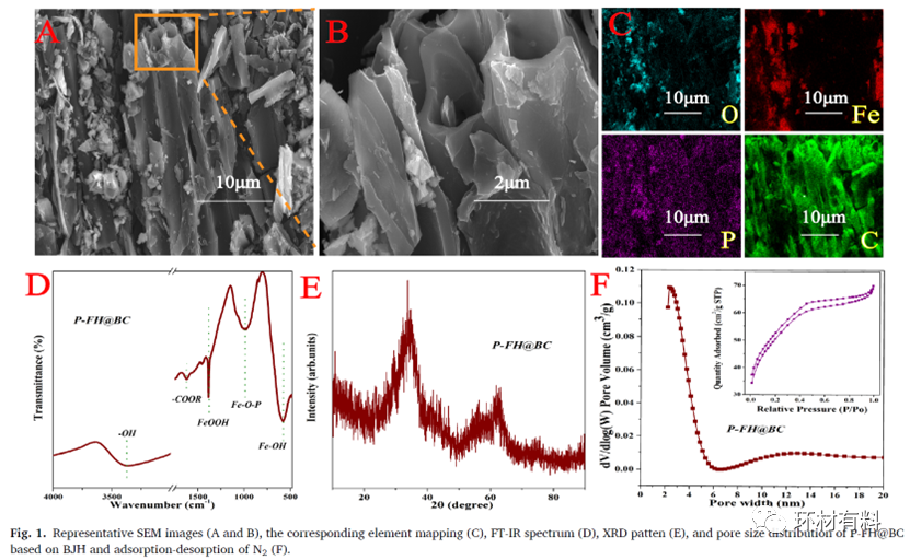 代表性SEM图像P-FH@BC如图1A和B所示。可以发现,一些纳米颗粒粘附在生物炭表面的自然空腔和大孔径上,这大大避免了团聚现象。相应的元素映射图像(图1C)显示,P、Fe和O元素分布在生物炭表面。新鲜的P-FH@BC、氧化铁和铁磷化合物(图1D)。如图1F所示P-FH@BC为2–6 nm,表明P-FH@BC是一种典型的小介孔材料,比表面积为178.96m2/g,孔体积为0.011625cm3/g,有利于孔填充。