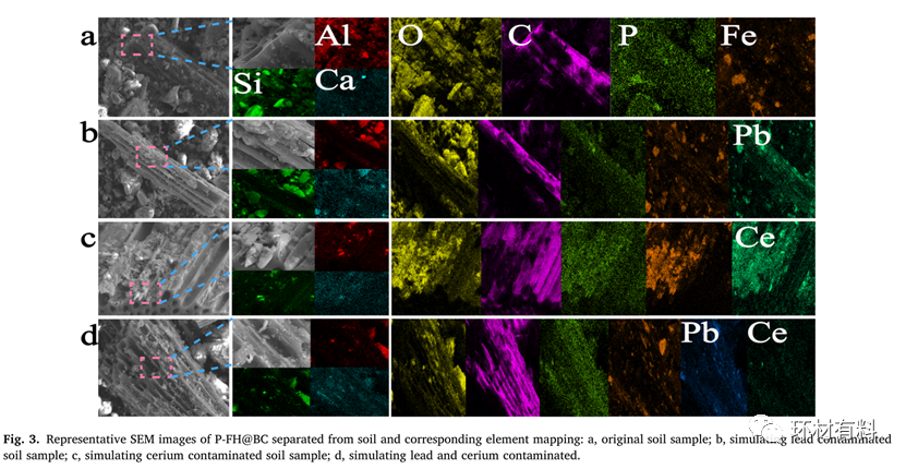 从修复土壤中分离出的P-FH@BC的SEM图像(图3)显示,土壤中的Si、Al、Ca等元素可能结合在P-FH@BC的表面。与图S3相比,在P-FH@BC表面可以观察到大量的铅和铈(图3b, c, d),说明P-FH@BC是一种有效的铅和铈钝化材料。值得一提的是,与新鲜的P-FH@BC相比,钝化90 d后,P-FH@BC的形态基本保持不变(图1A-C),说明P-FH@BC在土壤中表现出令人满意的稳定性。此外,从共存土壤中分离出的P-FH@BC中铅和铈的分布(图3d)表明,更多的铅位于P-FH@BC的表面。![]()