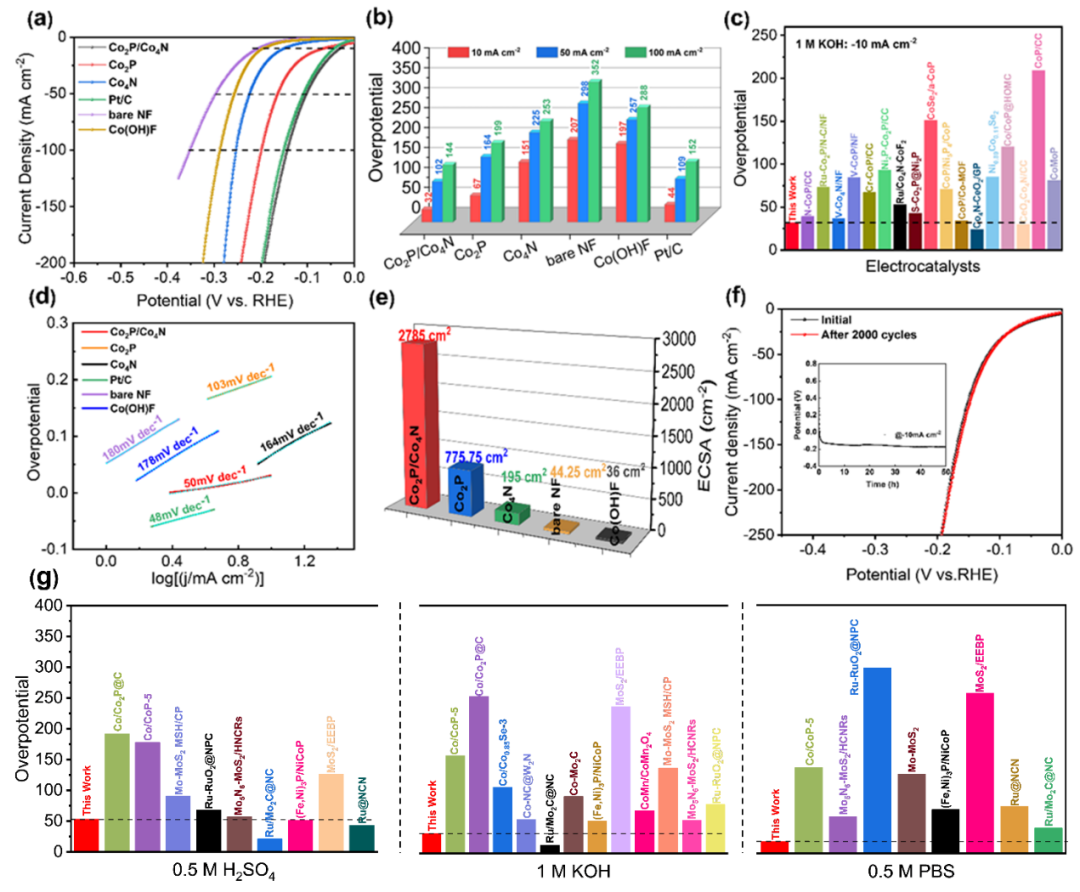 图3. 样品的HER测试结果:分别为(a)LSV曲线,(b)电流密度为10、50和100 mA cm−2时的过电位,(c)Co2P/Co4N与其它钴基电催化剂在1 M KOH条件下的催化性能比较,(d) Tafel曲线,(e) ECSA拟合结果,(f)Co2P/Co4N在2000循环试验前后的极化曲线,插图为在1 M KOH中测量稳定性测试,(g)在全pH环境下,Co2P/Co4N催化剂与其它肖特基异质结电催化剂催化性能的比较。