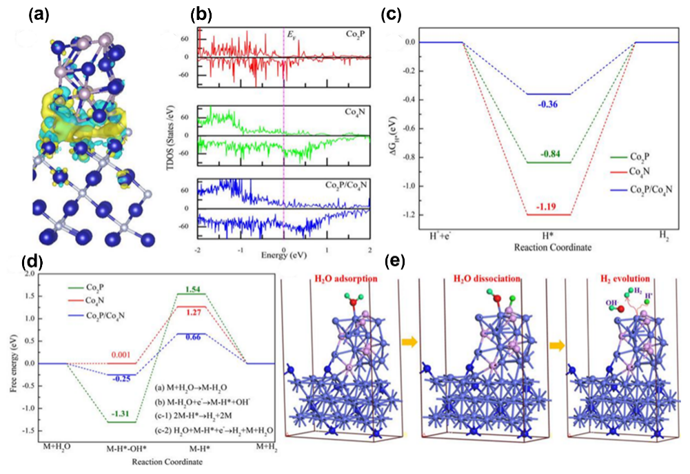 图4(a) Co2P/Co4N界面处的电子密度差异图,(b) Co2P、Co4N和Co2P/Co4N的DOS曲线,(c)计算出Co2P、Co4N和Co2P/Co4N氢吸附自由能图,(d) Co2P、Co4N和Co2P/Co4N的阶梯状态图,(e) Co2P/Co4N催化剂上HER路径示意图。