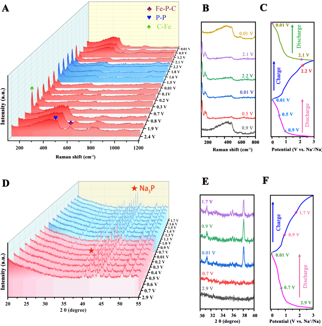 图3 (A-C) Fe2P@C恒电流充放电的原位Raman信息;(D-F) Fe2P@C恒电流充放电的原位XRD信息。