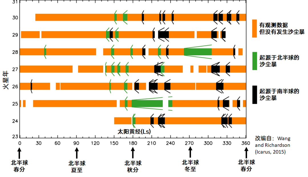 这是1996年到2013年(即火星年23-31)间,火星全球探勘者号(MGS)和火星勘测轨道飞行器(MRO)两个环绕器观测的沙尘暴记录。可以看到火星的沙尘活动集中在下半年,北半球在春夏期间最为宁静。从春分到夏至正中间开始的6个地球月里,北半球历史上没有发生过沙尘暴。