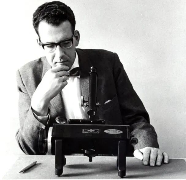 施密特很快写了一篇的论文,讨论了3C 273的光谱,并将其中的发射线解释为被红移了0.158倍之后的氢、镁与氧线。这篇论文发表于《自然》(Nature),标题是《3C 273:一个大红移的类星物体》。[14]事实上,那一期的《自然》连续刊登了4篇密切相关的论文,第一篇是哈扎德等人测量3C 273的精确位置的论文[10],第二篇是施密特确定3C 273的红移的论文[14],第三篇是奥克发现3C 273的红外发射线的论文[15],第四篇是格林斯坦与马修斯确定3C 48的红移的论文[16]。在这篇不到1页的划时代的论文中,施密特报告了自己的观测,并指出,3C 273的红移基本上不可能是恒星的引力造成的“引力红移”,而是由宇宙膨胀导致的“宇宙学红移”。施密特认为,3C 273是一个星系的核心,该星系的红移是0.158,它的速度是光速的0.158倍,即47400千米每秒。施密特计算出3C 273与地球的距离约为5亿秒差距,即约16亿光年(根据现代的哈勃常数计算得到的数值是24.4亿光年)。施密特还计算出3C 273的直径小于1000秒差距(3262光年,1000秒差距只是粗略估计值,并非精确值)。施密特不仅正确解释了3C 273的红移,而且正确地猜想它是一个星系的核心,显示出他大胆而超前的思维。1965年,施密特发表了另一篇重要的论文,公布了5个主要由他发现的新的类星体[17],其中有3个的红移为1,最远的那个的红移更是高达2。正如他自己所说:“我们现在可以轻易获得很高的红移(的类星体),因为这些该死的东西实在太亮了。”[注6]1965年,使用显微镜测量光谱的施密特。图片来源:[18]