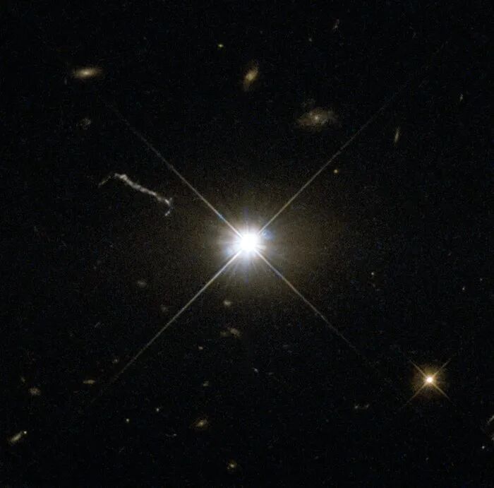 1960年9月,桑德奇用海耳望远镜观测了表中的第48号射电源——3C 48,探测到一颗大约为16等的类似于恒星的蓝色天体,周围有一小缕星云状的物质。马修斯与桑德奇都认为这是一颗前所未见的“射电恒星”。[7]尽管16等星比大多数人能够看到的最暗的星(6等)还暗了1万倍,但在海耳望远镜的“眼”中显然算是亮星了。桑德奇拍摄了它的光谱,并测量了光谱中的一些发射线,发现根本无法与实验室中的光谱线对应上。桑德奇拿着3C 48的光谱与杰西·格林斯坦(Jesse Greenstein,1909-2002)等人交流。格林斯坦也无法得到明确结论。此外,桑德奇的持续观测还表明,3C 48的光学亮度每隔14天就会变化一半,据此可以推断出它的发光区域大小仅是太阳系大小的几倍。这个结果让桑德奇更相信这是一颗恒星。1962年,桑德奇拍摄了3C表中的3C 273的位置,发现了一颗大约为13等的浅蓝色星体,它的亮度是16等的3C 48的亮度的16倍。桑德奇还发现3C 273的中部有一根发光的“细刺”,像星云状物质。我们现在知道,这根“细刺”实际上是3C 273抛出的喷流。[7]哈勃空间望远镜(“哈勃”)的WFPC2拍摄的3C 273(中心亮点)的可见光图像。中心亮点左上方的一条柱状条纹是它发出的喷流,长度达到了20万光年左右。图片来源:[9]