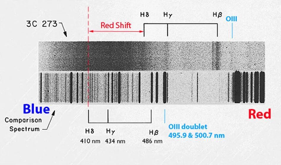 施密特发现3C 273的精确位置恰好与桑德奇发现那颗小而亮的蓝色“星”的位置重合。这意味着,那颗小蓝“星”就是3C 273的光学对应物。天文学的一场疾风骤雨马上就来临了。1962年12月27日,施密特用海耳望远镜拍摄了3C 273的光谱。由于它实在太亮,常规的曝光时间竟然使底片被过度曝光。[12]第二次与第三次,施密特都成功获得了它的光谱。施密特发现,3C 273的光谱非常奇怪,出现了9条相当宽的发射线。其中,中心波长为323.9纳米、503.2纳米、563.2纳米、579.2纳米的4条发射线尤其显著。被确定的还有459.5纳米与475.3纳米的两条谱线。其余3条谱线的中心波长误差范围较大。施密特无法确认这些发射线对应哪种化学元素。此后,他多次想破解这个谜团,但却毫无头绪。他深感苦恼,一度想放弃。差不多同时,施密特的同事贝弗利·奥克(Beverley Oke)用威尔逊天文台的100英寸(254厘米)口径的胡克(Hooker)望远镜拍摄了3C 273的光谱,光谱中显示出一条位于红外波段的强烈的发射线,它的波长为759.0纳米。1963年2月5日,周一,下午,施密特来到办公室,想继续思考自己得到的结果。当他把那张光谱底片放入仪器时,他突然意识到,他确认的发射线中的3条与奥克确认那条发射线的分布规律与氢的巴耳末(Balmer)线系[注2]中的几条线很像。然后,施密特脑中突然出现一个违背祖训的想法:这些光谱线可能就是氢的发射线,只是它们往红色一端移动(“红移”)了。这个看似疯狂的想法让施密特莫名兴奋,他马上在身边找到一条简陋的滑动刻度尺,[7]直接测量出移动的量,然后立即得到了3C 273的红移是0.158。也就是说,这些光谱是氢的光谱线,只是它们的波长被拉长了0.158倍。施密特乘胜追击,确定出所有被确认出波长的发射线的本质:奥克拍摄的那条线是氢的巴耳末线系中的Hα线;他自己确认的6条线中的4条分别是Hβ、Hγ、Hδ与Hε线。[注3, 注4]另外2条发射线则分别是一次电离镁(Mg II)与二次电离氧禁线([O III])。[注5]施密特拍摄的3C 273的光学光谱(上)与实验室中用以比较的光谱(Comparison Spectrum,下)。Blue表示蓝,Red表示红,Red Shift表示红移。下方的Hδ/410 nm、Hγ/434 nm与Hβ/486nm分别为实验室中的氢的巴耳末线中的3条与对应的波长。上方的相同记号表示它们被红移之后的位置。图片来源:[13]