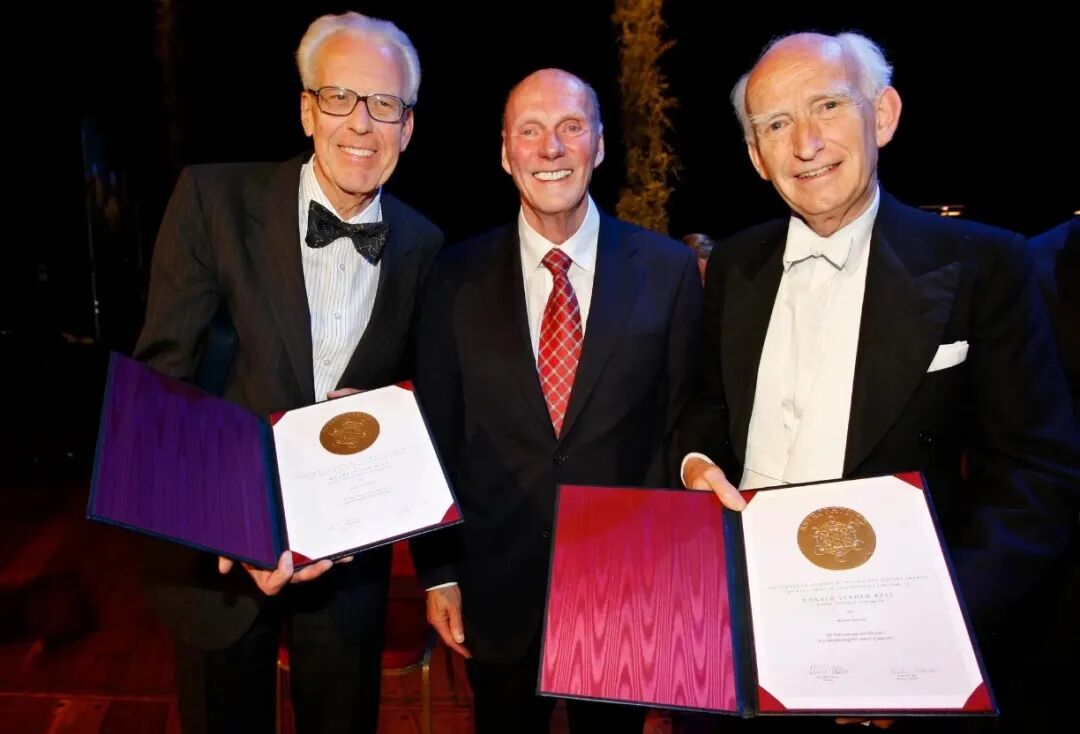 1972-1975年,他担任加州理工学院天文系主任。1976-1978年,他担任加州理工学院的数学与天文组主席。1978-1980年,他成为海耳天文台(Hale Observatories)的台长,该天文台由“威尔逊与帕洛玛天文台”改名而来。由于威尔逊天文台与帕洛玛天文台一直貌合神离,施密特于1980年拍板解散海耳天文台,使其恢复为原来的两个独立单位。他也因此成为海耳天文台最后一任台长。1996年,施密特光荣退休。但在此后大约十年,他继续从事研究并发表论文。由于对确认类星体并为人类认识类星体的各种重要性质做出重要贡献,施密特从1964年开始就开始获得了众多重要奖项。这些奖项包括1964年的沃纳奖(Warner Prize)、1978年的诺里斯·罗素讲席、1980年的英国皇家天文学会金质奖章(Gold Medal of the Royal Astronomical Society)、1991年的沃森奖章(James Craig Watson Medal)、1992年的布鲁斯奖章(Bruce medal)与2008年的首届科维里天体物理学奖(the Kavli Prize for Astrophysics,与林登-贝尔分享)。2008年,施密特(左)与林登-贝尔(右)领取首届科维里天体物理学奖。图片来源:[28]