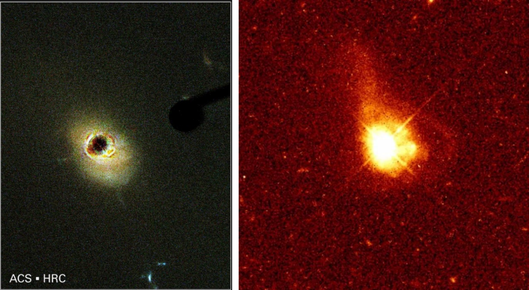 要想最终确定类星体到底是不是星系的明亮核心,最简单、最有力的方法就是寻找它所在的星系。如果能够找到类星体嵌在某个星系的中心的观测证据,施密特提出的这个想法自然就被证实了。1973年,克里斯蒂安(Jerome Kristian)用海耳望远镜拍摄了26个类星体,发现其中一部分类星体明显地嵌在一些星系的中心。这强烈支持了施密特提出的“类星体是星系的核心”的建议。不过,反对者依然可以说这些重合可能只是视线上恰好重合。1982年,托德·波罗森(Todd A. Boroson)与奥克发现了类星体3C 48周围的星系,并确认这个星系的红移与3C 48的红移相同。这直接证明类星体的红移确实是真实的宇宙学红移。后来的观测也在不断证实施密特的想法。例如,“哈勃”的ACS利用星冕仪屏蔽了3C 273的光之后,清晰地拍摄到它旁边的物质,后者就是3C 273所在的星系;这强有力地证明了3C 273是一个星系的核心。再如,“哈勃”的WFPC2拍摄的“类星体0316-346”的图像中,它周围的星系清晰可见。“哈勃”的ACS拍摄的3C 273附近的星系物质的图像(左)与“哈勃”的WFPC2拍摄的类星体0316-346的光学图像。在左图中,类星体发出的光已经被星冕仪屏蔽,这使得周围的星系物质可以被更容易拍摄到。图片来源:[26](左);[27](右)。