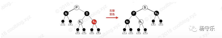 S 为黑色,S 的右孩子为红色。N 的父节点颜色可红可黑,且 N 是其父节点左孩子。这种情况下,我们对 P 进行左旋操作,并互换 P 和 S 的颜色,并将 SR 变为黑色。因为 P 变为黑色,所以经过 N 的路径多了一个黑色节点,经过 N 的路径上的黑色节点与删除前的数量一致。对于不经过 N 的路径,则有以下两种情况: