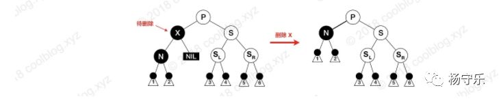 N 是新的根。在这种情形下,我们就做完了。我们从所有路径去除了一个黑色节点,而新根是黑色的,所以性质都保持着。