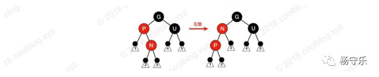 N 的父节点为红色,叔叔节点为黑色。节点 N 是 P 的右孩子,且节点 P 是 G 的左孩子。此时先对节点 P 进行左旋,调整 N 与 P 的位置。接下来按照情况五进行处理,以恢复性质4。