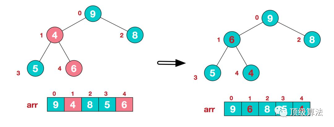 这时,交换导致了子根[4,5,6]结构混乱,继续调整,[4,5,6]中6最大,交换4和6。