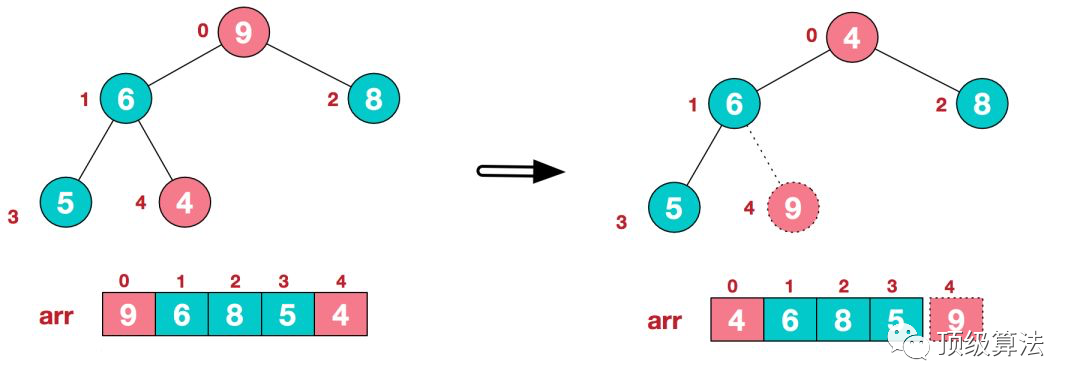 a.将堆顶元素9和末尾元素4进行交换