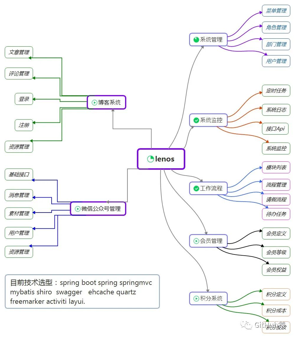 这是我目前见过最好的快速开发代码生成器系统项目。功能完整,代码结构清晰。值得推荐。 介绍 本项目系统是一款快速开发模块化脚手架,采用spring boot 2.0.1、spring、SpringMvc、mybatis、shiro、activiti工作流、swagger、ehcache、redis、quartz、freemarker、layui技术开发;博客采用vue前后分离,持久层集成tkmapper丰富简单数据交互,支持mysql/sqlserver数据源,实现功能有系统模块:菜单管理、用户管理、角色管理,系统监控:系统日志、接口api、sql监控、可配置化定时任务,工作流程管理:流程管理(动态给节点配置角色)、模块列表(新建编辑发布流程)、请假流程、待办任务。博客模块为单独的前端后台多页面,服务为lenosp。登录账号:admin 密码:123456 思维导图 功能说明