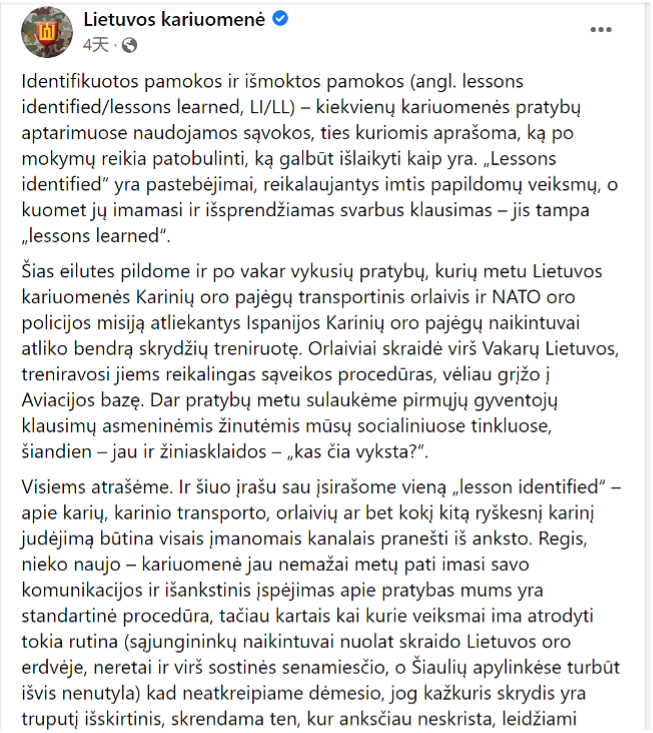 当地时间7月8日,立陶宛军队的Facebook账号也发文确认了这是一场军事演练,并公布了参加演习的战机图片。文章称:“在昨天的演习中,立陶宛空军一架运输机和西班牙空军一架执行北约空中警戒任务的战斗机进行了联合飞行训练......飞机飞越立陶宛西部,练习了互相操作程序,随后返回空军基地。”