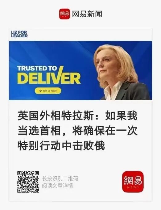 在文中,特拉斯三次提及俄罗斯。在文章开头,特拉斯表示,“咄咄逼人的俄罗斯”是英国在海外面临的巨大挑战。她在宣布自己参选时写道:“我将以保守党的身份参加竞选,以保守党的身份执政。无论是确保弗拉基米尔·普京在乌克兰问题上落败还是推动经济发展,我都会以首相的身份全力以赴。”此外,她还回顾了自己担任外交大臣期间的成就:“作为外交大臣,我帮助领导了国际社会对普京在乌克兰战争的反应,并通过对……克里姆林宫施加痛苦,提供了一个引领世界的严厉制裁方案。”但是,这篇评论文章更像是一种模糊的参选口号——特拉斯并没有明确提及若自己当选,将会以何种方式“打败俄罗斯”,更不用说所谓的宣布参与军事“特别行动”。