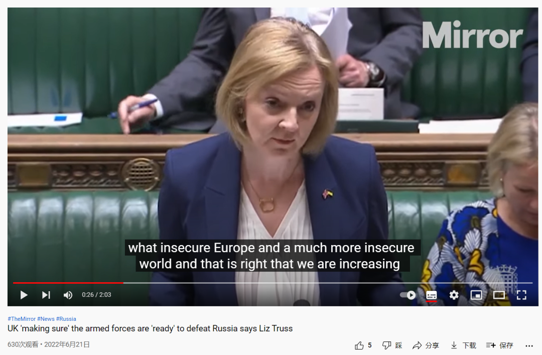 在宣布参选之前,特拉斯作为外交大臣接受议会质询时表示会继续增加国防开支、加强训练,帮助英国“东翼的盟友们”(乌克兰)。