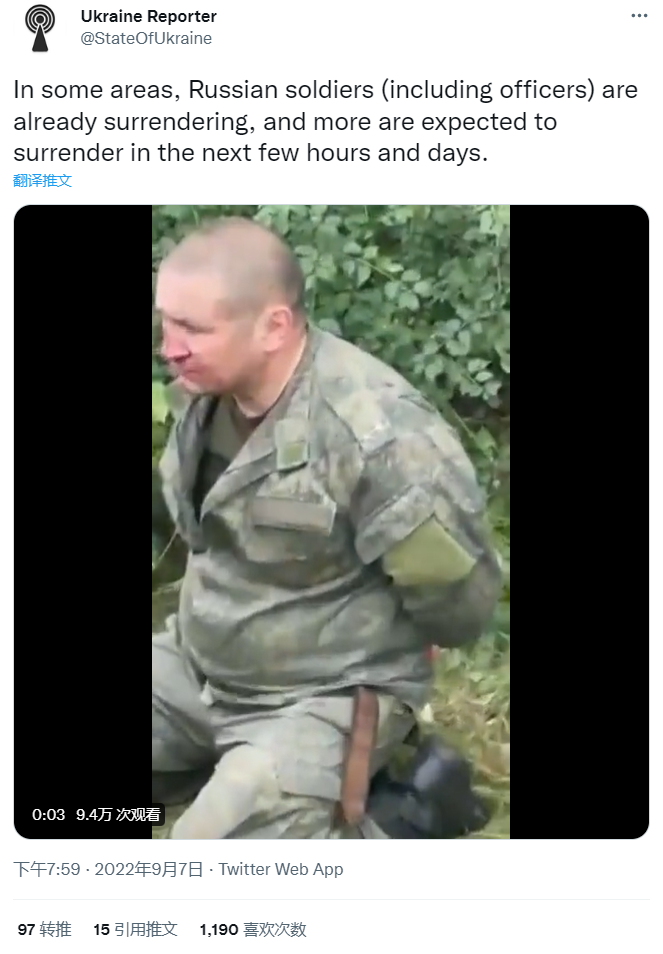 抖音视频截图中的推特账号“Ukrainian Defense Staff”于北京时间9月9日发布的推文称:“俄罗斯士兵(包括军官:俄罗斯西部集团军指挥官中将)已经投降了,预计会有更多在接下来的几个小时和几天内投降。”