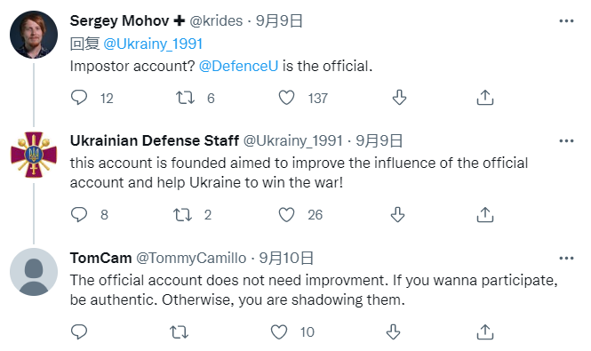 由于该账号头像和昵称具有一定欺骗性,有一名为“Sergey Mohov +”的推特网友在其推文下指出:“骗子账号?@DefenceU才是官方的。”这条评论获得“Ukrainian Defense Staff”回复:“此账号是为增强官方账号的影响力、帮助乌克兰赢得战争而设立的。”由此可知,该账号并未声明,其由乌克兰国防部官方或相关方认证、运营。而经查证,乌国防部也从未就此俘虏身份作出回应。因此,所谓“乌克兰武装部确认”的说法不实。