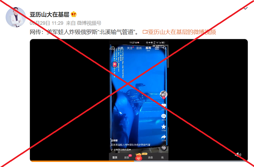 9月29日,多位抖音、微博用户声称,网络上有攻击“北溪”管道的蛙人视频流出。相关视频显示,有穿戴潜水装备的人员在水面下活动。