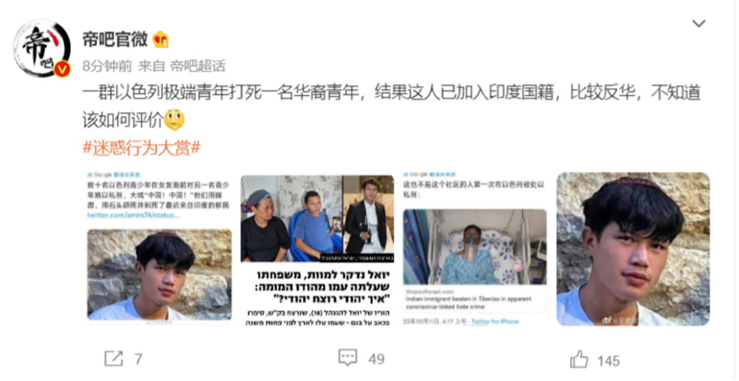近日,微博上流传一种说法,称“一群以色列极端青年打死一名华裔青年,结果这人已加入印度国籍,比较反华”。