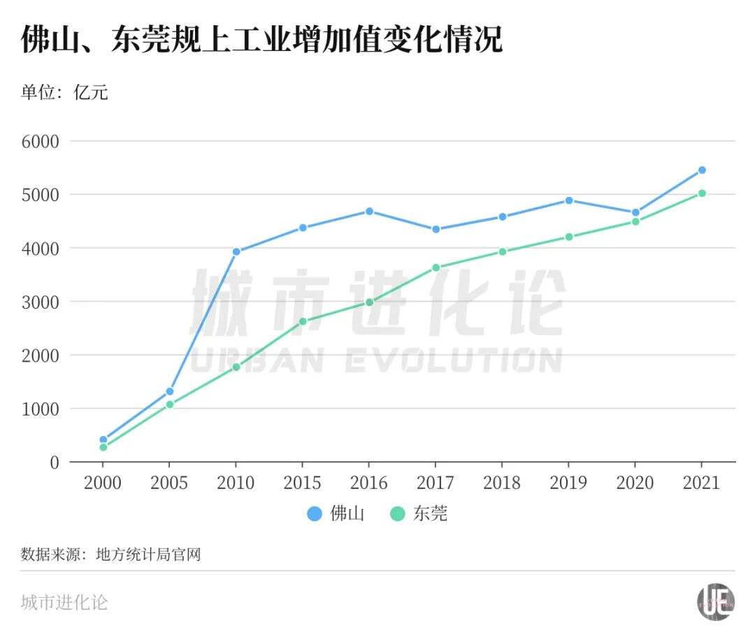 但就在2021年,佛山强势发力,以5442.13亿元的规上工业增加值,将领先东莞(5008.81亿元)的优势拉大。