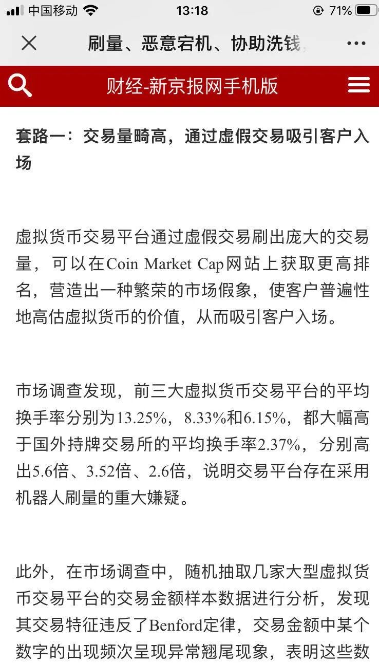 央行指出,目前,虚拟货币交易所存在三大套路:第一,通过虚假交易制造畸高交易量,营造市场繁荣假象,诱引投资者入场。