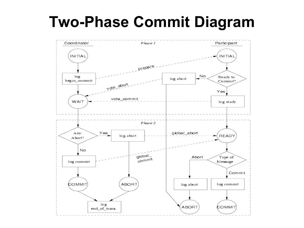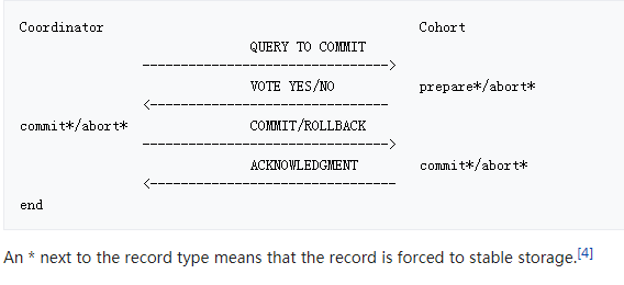 注意,上图中最下面一行也表明,两阶段提交协议也依赖与日志,只要存储介质不出问题,两阶段协议就能最终达到一致的状态(成功或者回滚)而下图(来自slideshare)详细描述了整个流程: