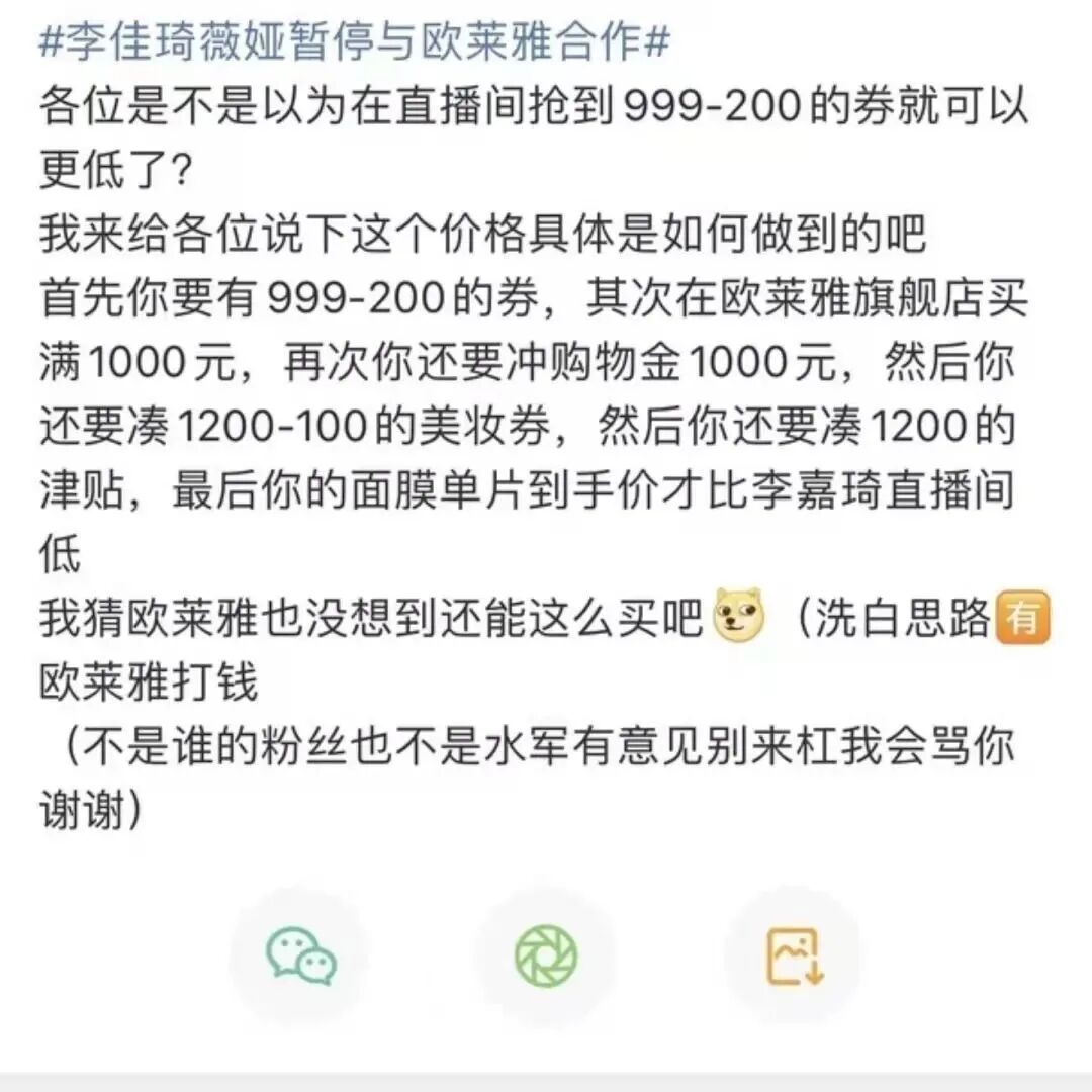 在客服的说法里,李佳琦无法决定优惠的程度,一切都由官方活动策划决定。但事实上,这个“全网最大力度”的说法最先并非出自于李佳琦薇娅本人,恰恰源自于欧莱雅的官方微博。某种程度上正代表了官方活动策划的意思。