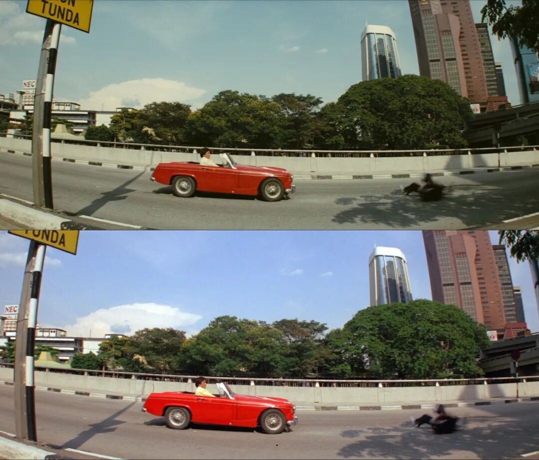 三个截图对比,上方绿油油的为之前的4K修复,下方为尤里卡新制作的4K修复,明显颜色要正了不少。不过尤里卡修复版画面构图明显比之前4K修复四周少了一圈,更接近之前标清修复版的构图,可能是考量当初胶片洗印后的构图范围做的抉择。